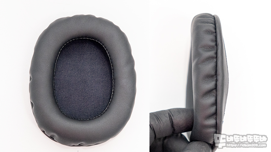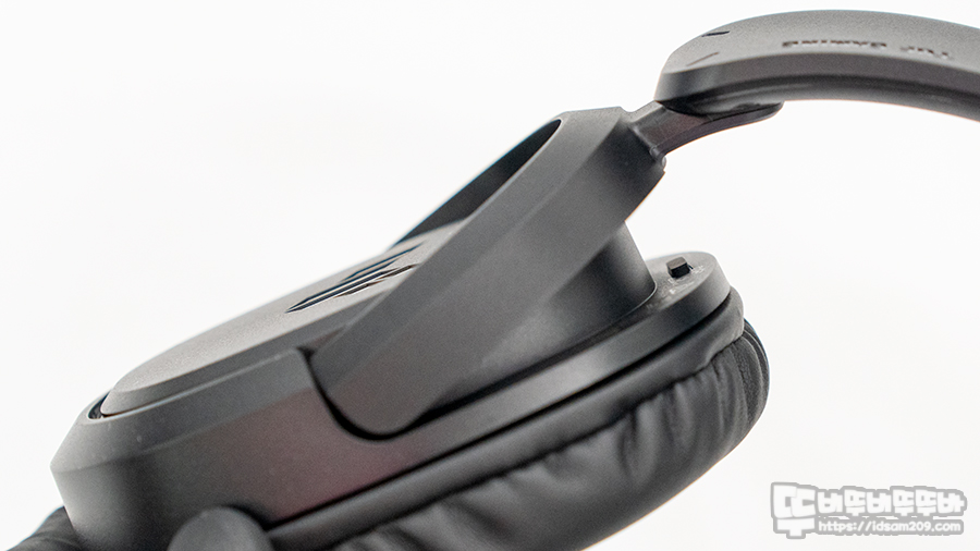 이어컵 하우징과 오버이어 이어패드는 약간의 경사로 틀어진 디자인이 적용하여 귀의 형태에 맞게 착용이 가능하며 탈부착이 가능한 이어패드는 탄탄한 쿠션감을 주는 타입이 아니라서 오랜 시간 사용 시 이어패드 눌림이 발생할 걸로 보입니다.