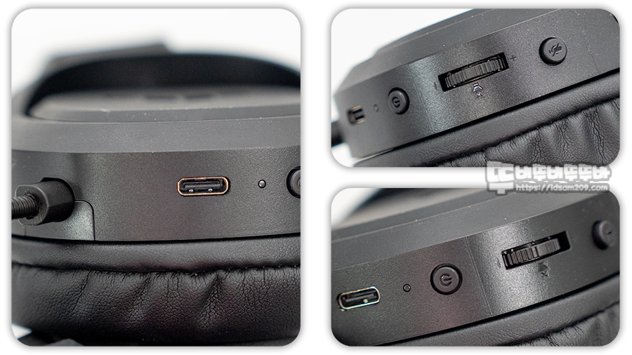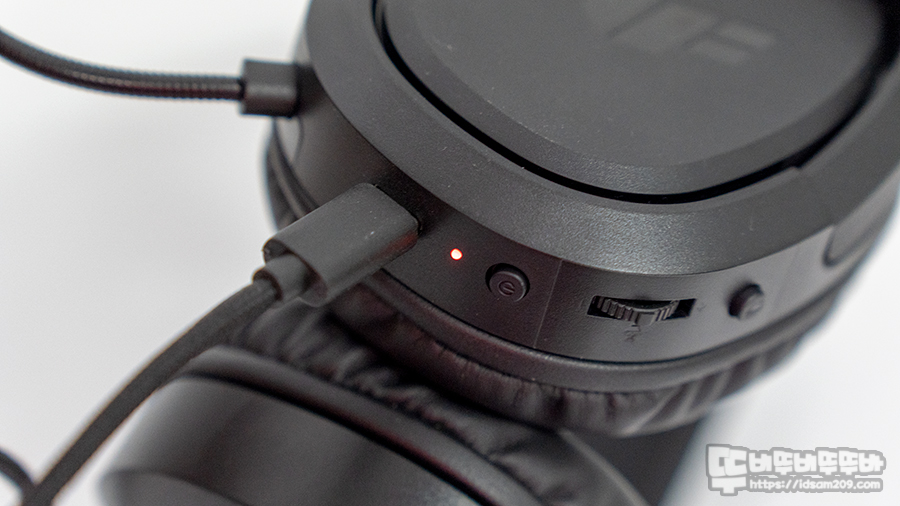 헤드셋 오른쪽에 몰려있는 컨트롤러 부분을 살펴보면 아래쪽에 USB-C 충전 단자와 배터리 상태를 알려주는 LED 인디케이터, 전원 버튼, 틸트 형태로 조절되는 볼륨 조절기, 마이크 On/Off 버튼으로 구성되어 있고요.