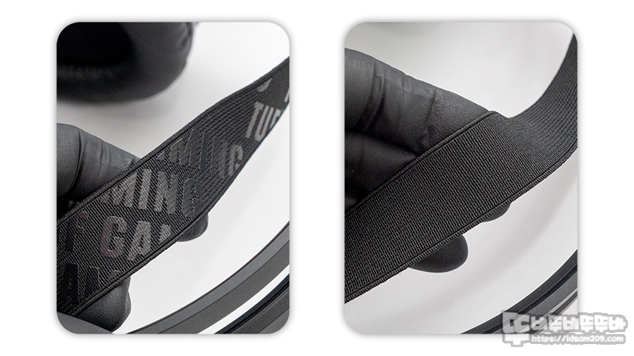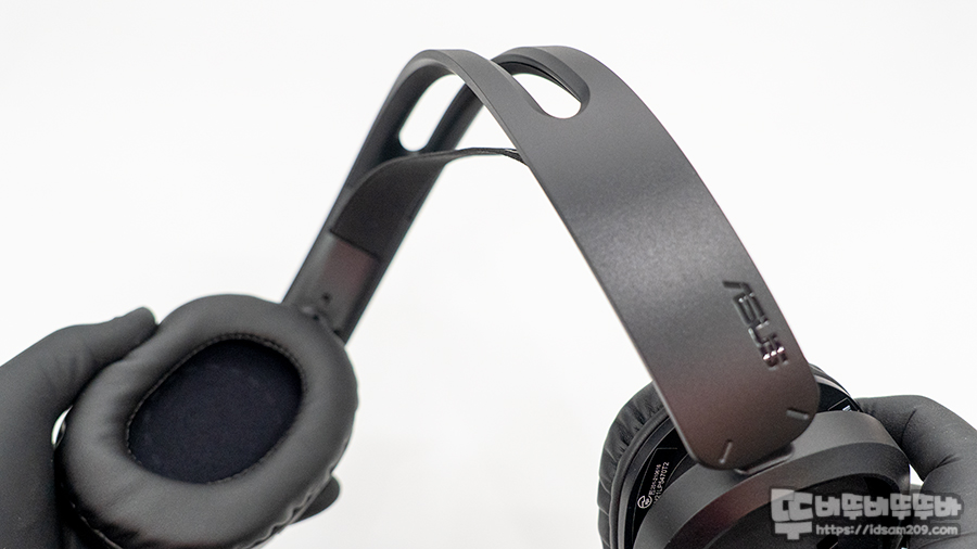 ASUS TUF H1 WIRELESS 무선 게이밍 헤드셋은 길이 조절이 가능한 헤어밴드 디자인이 아닌 아치형으로 디자인된 프레임에 서스펜션 역할을 하는 스포츠 밴드를 사용한 헤어밴드가 사용된 이중구조로 경량화된 느낌을 주고 있습니다.
