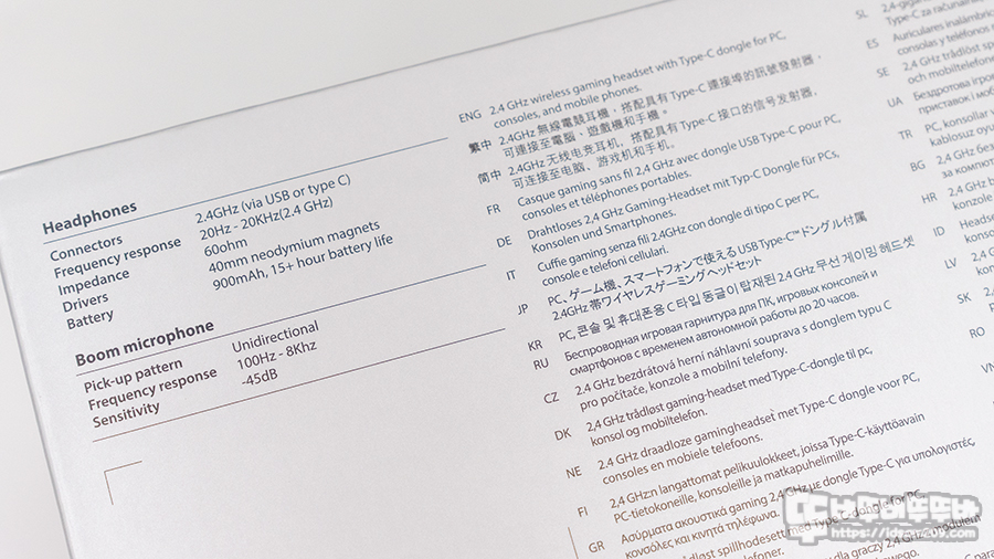 2.4GHz 무선 / 응답 주파수 20Hz~20kHz / 임피던스 60Ω / 40mm 드라이버 유닛 / 900mAh 리튬 폴리머 배터리 내장 15시간 사용 / 단방향 마이크 / 응답 주파수 100Hz~8kHz / 마이크 감도 -45dB 등의 정보를 확인할 수 있습니다.