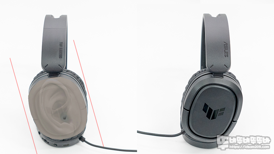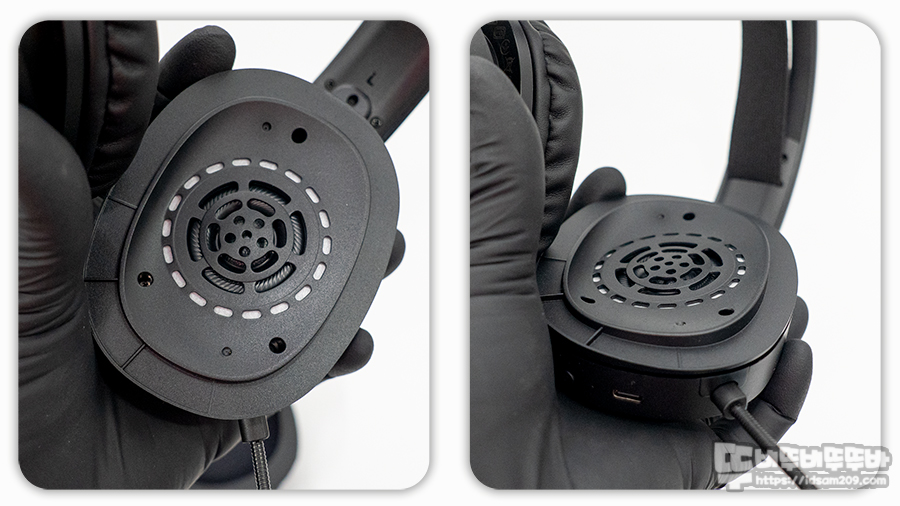 이어컵 하우징과 오버이어 이어패드는 약간의 경사로 틀어진 디자인이 적용하여 귀의 형태에 맞게 착용이 가능하며 탈부착이 가능한 이어패드는 탄탄한 쿠션감을 주는 타입이 아니라서 오랜 시간 사용 시 이어패드 눌림이 발생할 걸로 보입니다.