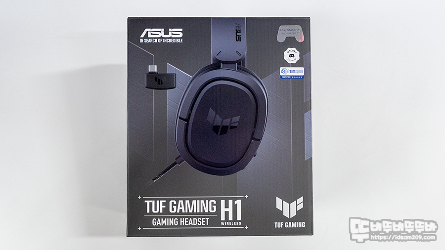 ASUS TUF H1 WIRELESS 무선 헤드셋 패키지에는 무선 제품임을 확인할 수 있는 무선 리시버와 헤드셋 사진 그리고 모델명 그리고 PS5 지원, Discord 인증, teamspeak 인증에 대한 내용을 확인할 수 있네요.