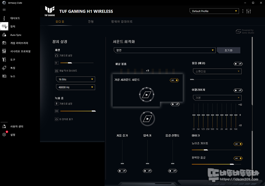 ASUS 제품에서 필수적으로 사용하게 되는 Armorary Crate - 장치 - TUF GAMING H1 WIRELESS 선택하면 사운드 관련 설정이 가능한데요.
