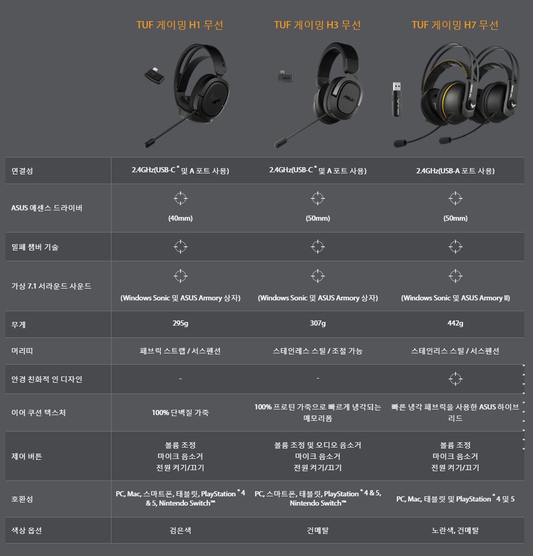 이전에 TUF H3 무선 헤드셋을 리뷰한 적이 있어서 어떤 차이가 있는 비교 도표를 준비해 보았습니다.