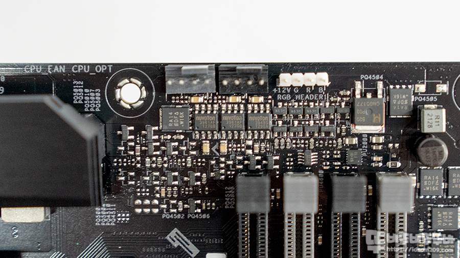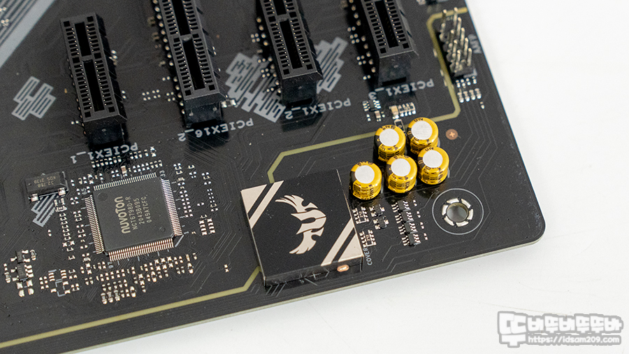 SATA 포트 아랫부분에는 RGB 라이팅이 표현되는 라이팅 존이 있어 메인보드에 전원인 공급되면 기판 뒷면에 LED 빛이 전면으로 표현되지만 메인보드 라이팅 존의 크기가 작은 편이라 조금 아쉬움이 있네요.