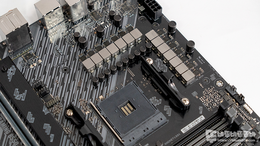 ASUS TUF Gaming B550-PRO는 AMD AM4 소켓을 사용하는 모델로 메인보드 전원부에 대형 히트싱크와 고품질 서멀패드를 사용하여 전원부 발열 해소를 담당하고 있으며 히트싱크를 제거하면 12+2 페이즈의 전원부를 확인할 수 있습니다.