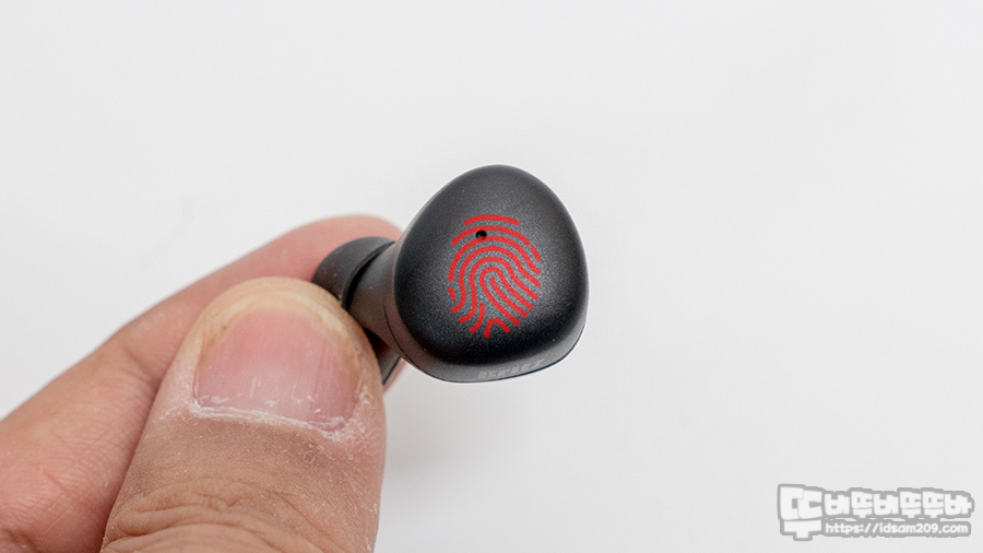 무선 이어버드는 겉보기엔 삼각형 느낌의 조약돌 느낌을 주며 이어버드 하우징 바깥 면에 마이크 및 LED 인디케이터가 내장된 홀을 확인할 수 있으며 넓적한 면적에 터치센서가 내장되어 터치 컨트롤을 지원하고요.