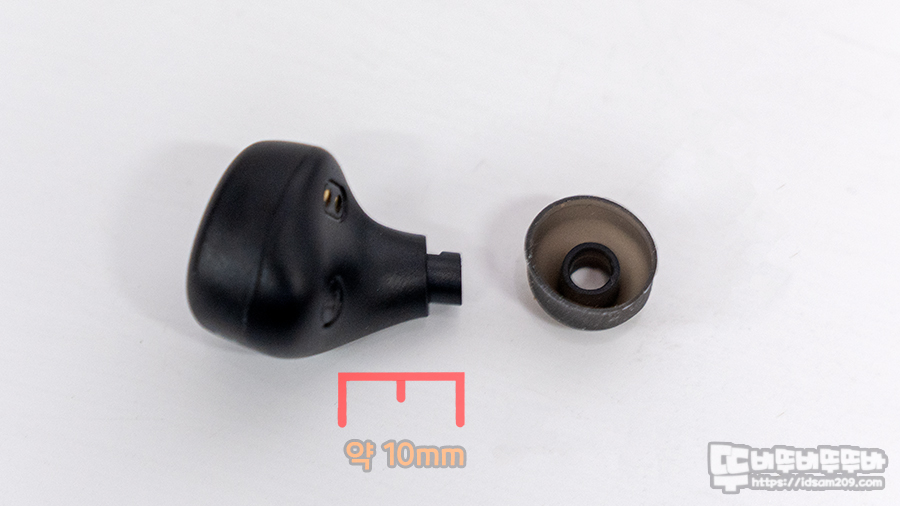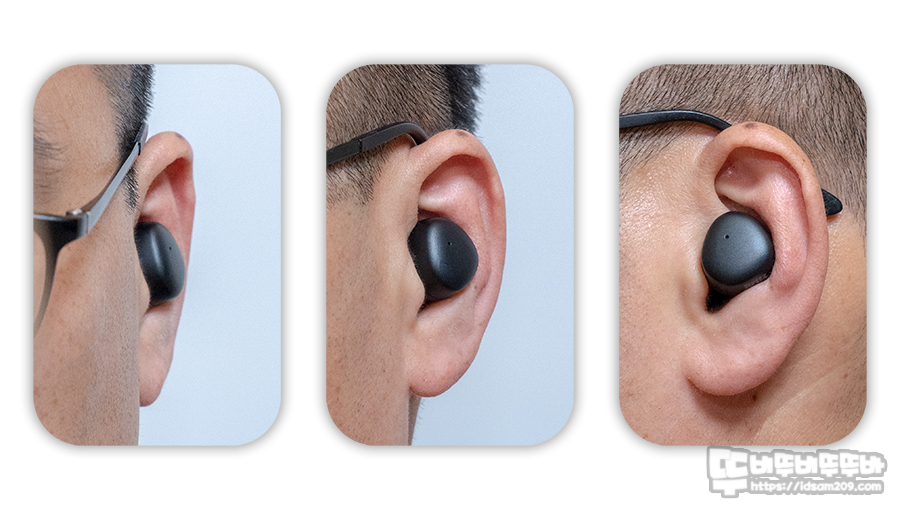 특히 무선 이어버드의 하우징 구조를 살펴보면 귀속에 들어가는 부분이 약 10mm 길이로 귀속 깊숙이 들어가는 타입이기에 실리콘 이어팁이 귓구멍을 꽉 막는 형태가 된다면 이압으로 인한 울림, 먹먹함이 느껴질 수 있고 터치 컨트롤 시 이어버드가 눌리면서 착용감에 변화를 줄 수 있으니 실리콘 이어팁을 잘 선택하여 편안하게 사용하시기 바랍니다.