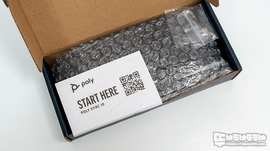 제품은 사용 스타트 가이드, Poly SYNC10 본체, USB-A to C 변환 젠더로 구성되어 있는데요.
