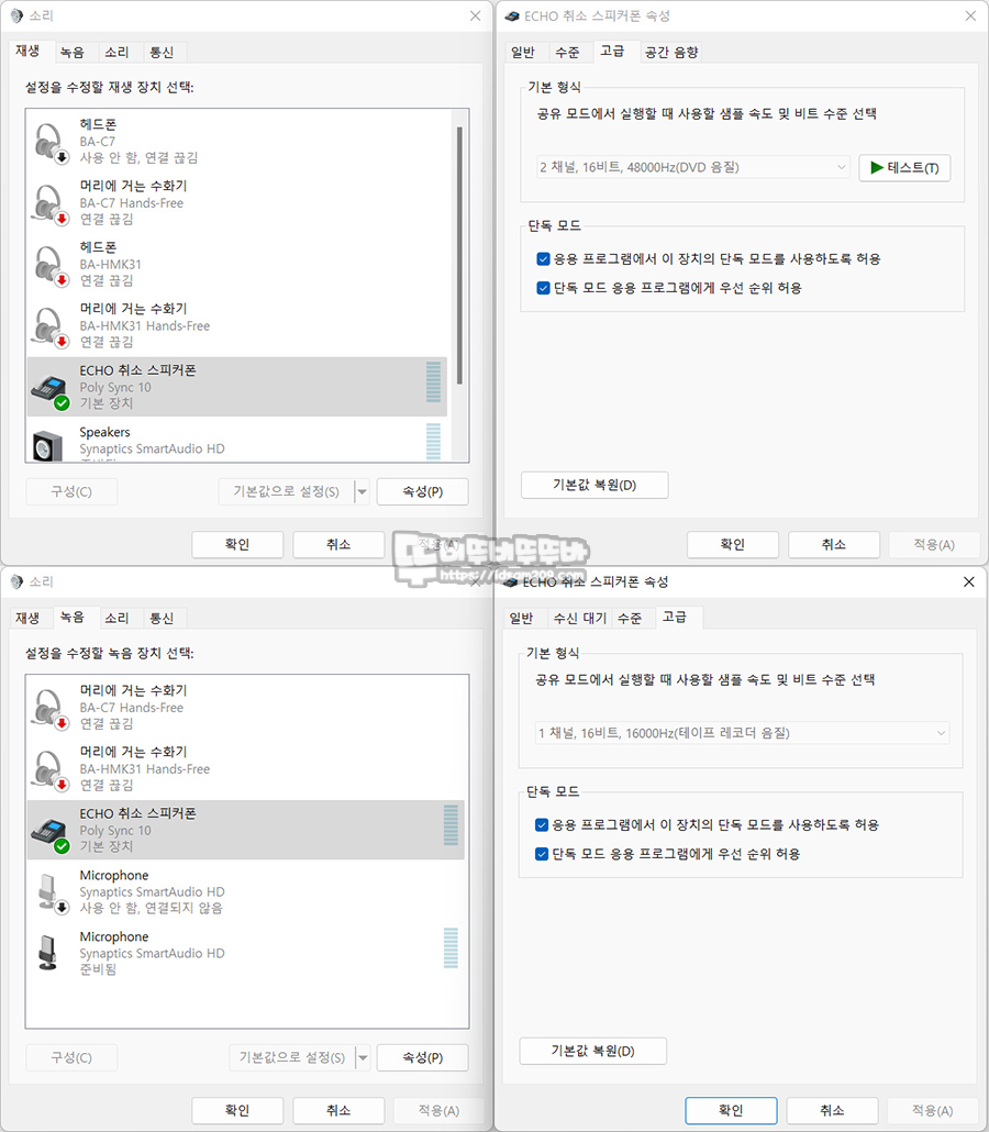 컴퓨터에 USB 연결 후 자동으로 인식된 내용을 확인 시 스피커는 2채널 16비트 48kHz, 마이크는 1채널 16비트 16kHz의 성능을 지원하는 것을 확인할 수 있습니다.