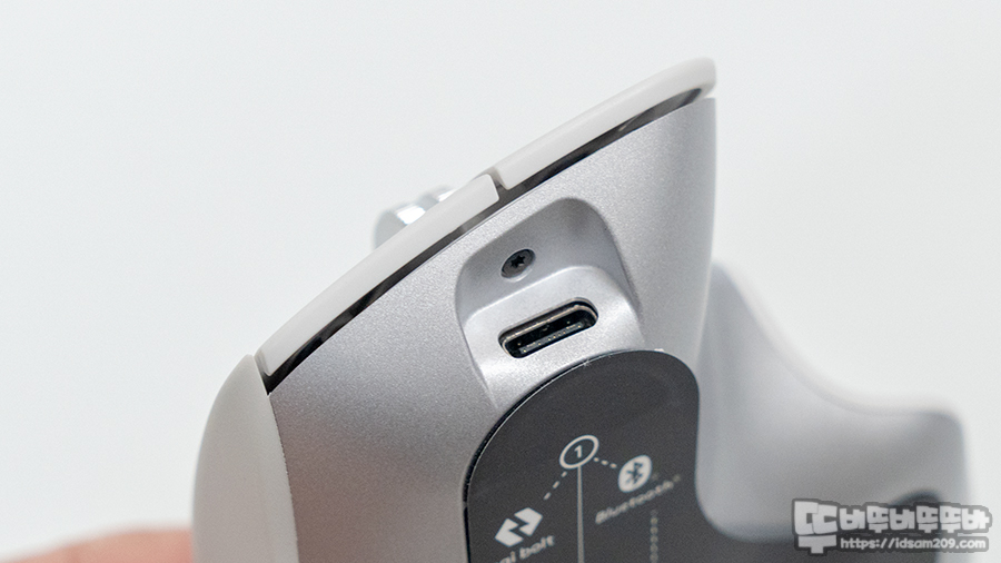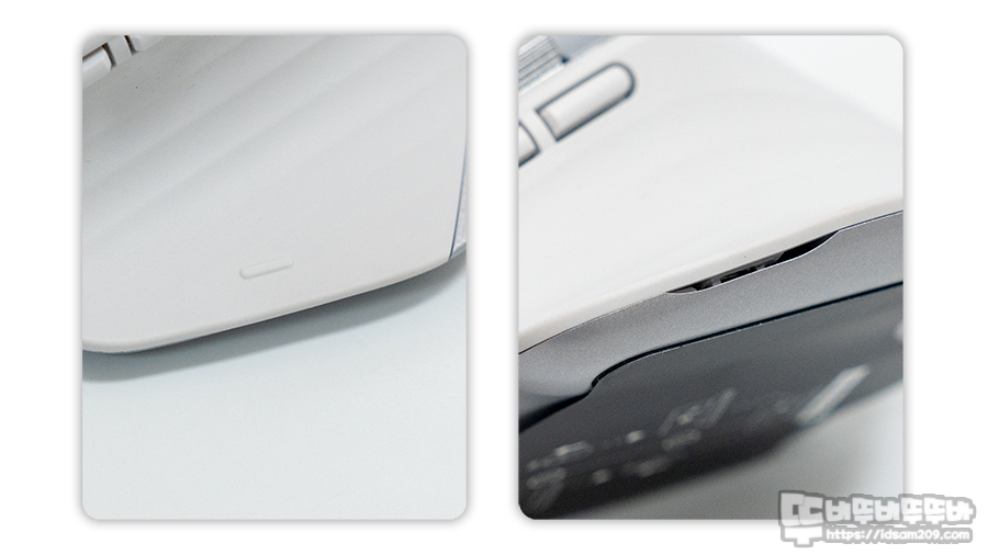마우스 왼쪽에는 엄지 휠 또는 썸 휠로 불리는 위/아래 회전으로 작동하는 스크롤 버튼과 다소 작은 느낌의 사이드 버튼 그리고 배터리 상태를 알려주는 LED 인디케이터 모습을 확인할 수 있고요.