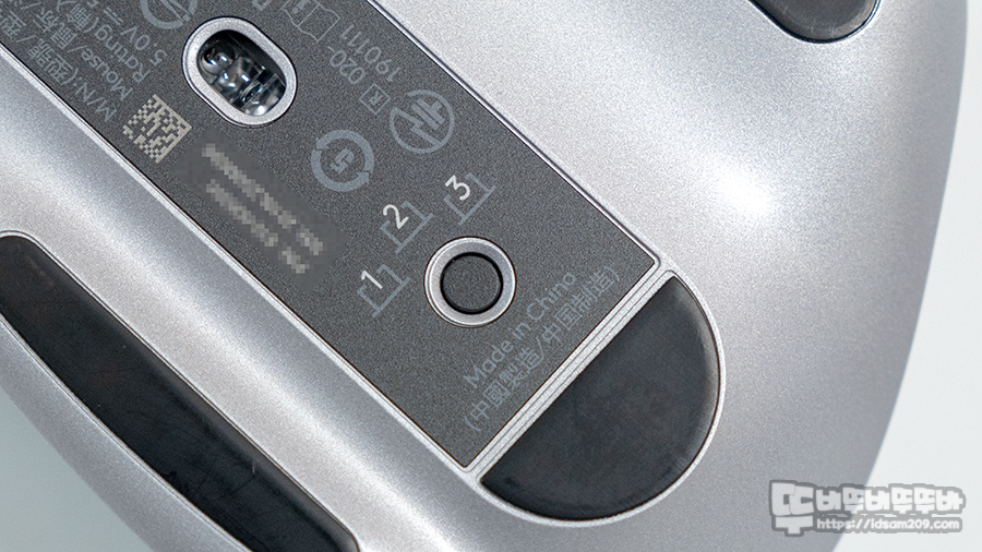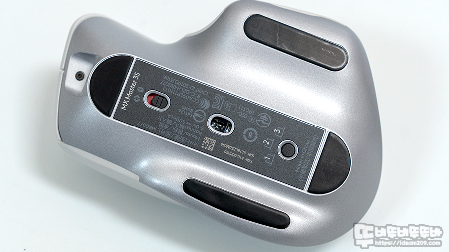 마우스 바닥면에 페어링 버튼을 이용하여 3개의 기기에 멀티 페어링이 가능한데 짧게 1번 눌러서 1 / 2 / 3 기기 전환, 길게 눌러 페어링 모드로 진입이 가능하며 페어링 모드에서는 LED 인디케이터가 빠르게 점멸하는 표현해 줍니다.