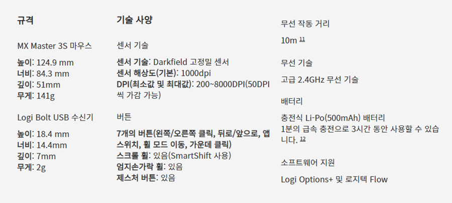 서두에 설명드린 무소음 스위치와 최대 8,000 dpi 지원 등 일부 스펙만 차이가 있으며 기본적인 스펙과 성능은 이전 모델인 MX Master 3와 비슷하니 참고하시기 바랍니다.