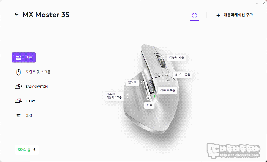 전체적으로 살펴보면 버튼 기능, 포인트 및 스크롤, Easy Switch 연결 상태, Flow 설정 등으로 구성되어있며 상단의 애플리케이션 추가 시 프로그램이 실행되면 각각의 프로그램 기능에 맞게 설정된 기능을 사용할 수 있는 편리함을 제공합니다.