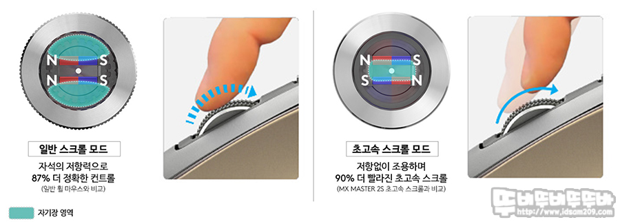 여기에 1초에 1000줄을 스크롤 할 수 있는 자석을 이용한 무한 휠은 마우스 상단의 버튼을 이용하여 구분감 없이 또는 약간은 구분감이 있는 느낌으로 사용이 가능합니다.