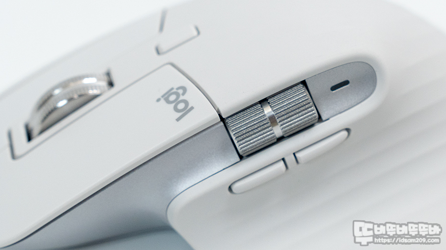 마우스 왼쪽에는 엄지 휠 또는 썸 휠로 불리는 위/아래 회전으로 작동하는 스크롤 버튼과 다소 작은 느낌의 사이드 버튼 그리고 배터리 상태를 알려주는 LED 인디케이터 모습을 확인할 수 있고요.