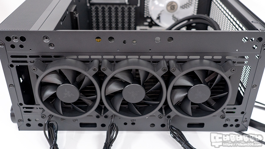 앞서 설명드린 대로 케이스 상단에 3열 수냉 장착이 가장 이상적인 방법인데 케이스에 장착이 불가능하여 케이스 전면 샤시에 샌드위치 방식으로 수냉쿨러 조립해 보았습니다.