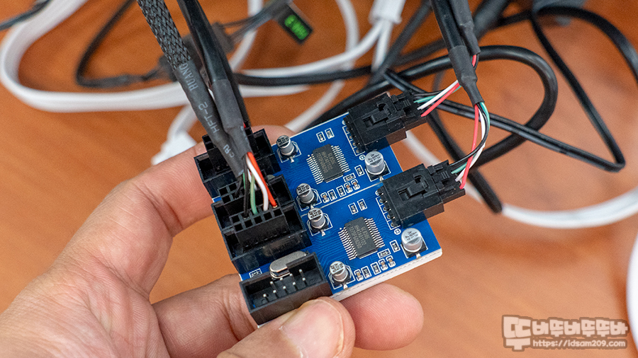 보통의 메인보드는 2개의 USB 2.0 9핀 커넥터를 제공하기에 부족한 USB 2.0 소켓을 위해 사진과 같은 허브를 구입하시면 좀 더 편리하게 조립할 수 있습니다.