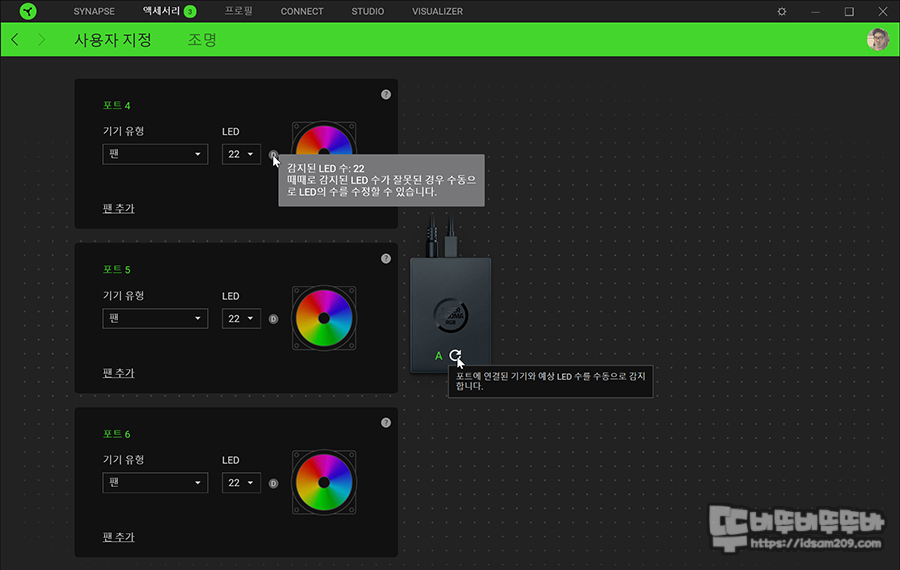 ARGB 컨트롤러와 팬 컨트롤러가 좋은 점은 연결된 커넥터를 자동으로 감지하여 알려준다는 점인데 제품을 연결할 때 케이스의 구조에 따라 구역을 나눠서 연결을 해두면 관리하기 편할 거 같네요.