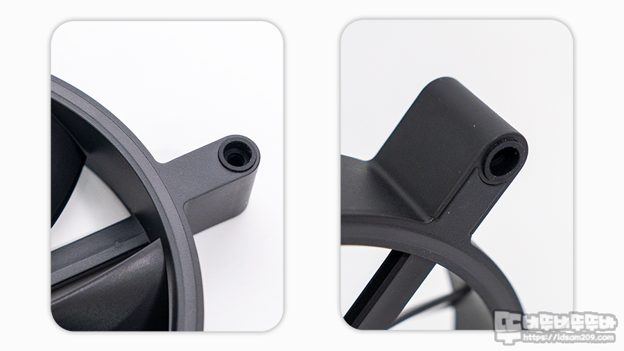 120mm 쿨링팬과 동일한 디자인으로 22개의 Addressable RGB로 구성된 ARGB LED 라이팅은 쿨링팬 프레임을 통해서 앞뒤로 발산하며 쿨링팬 고정 홀에는 샤시에 진동 전달을 차단해 주는 실리콘 댐퍼가 사용된 것을 확인할 수 있습니다.