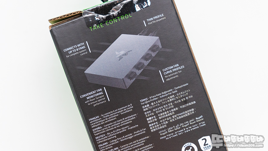 RAZER 로고 모양이 인쇄된 컨트롤러는 좌우 사이드의 4개의 PWM 4핀 커넥터 지원으로 총 8개의 쿨러를 제어할 수 있습니다.