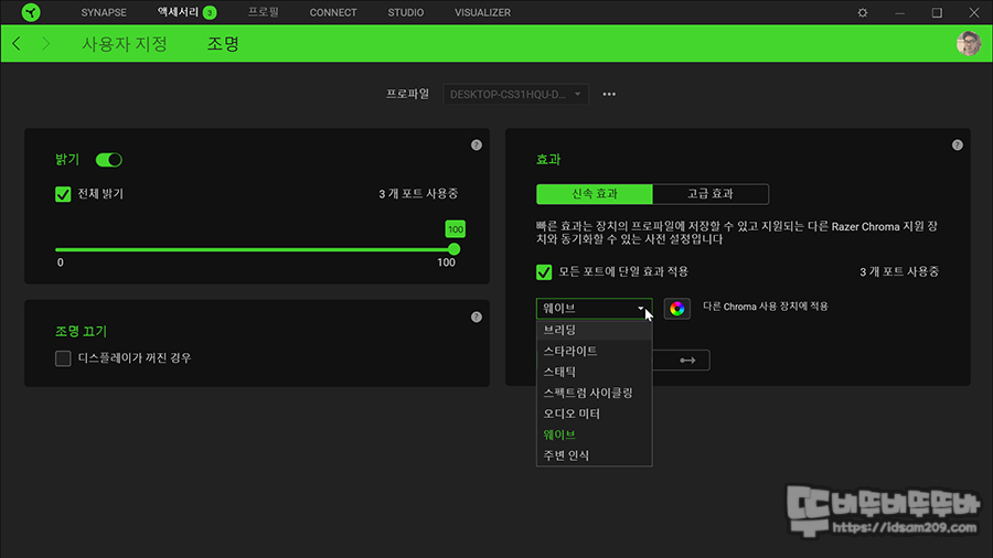 조명 항목에서는 LED 밝기와 효과를 선택할 수 있는데 기본 효과를 보여주는 신속 효과와 크로마 스튜디오를 이용한 커스터마이징이 가능한 고급효과 그리고 RAZER Synapse를 통해 다른 크로마 장치의 LED 효과를 통일할 수 있습니다.