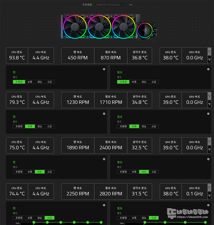 rpm 변화를 통해 69~61도 사의 CPU 온도, 33.9~ 30.3도 냉각 수 온도 변화를 확인할 수 있었으며 일반적인 웹서핑같이 부하가 적은 작업에서는 보통 모드가 가장 무난해 보이네요.