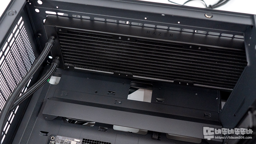 수냉쿨러 장착 시 장착 나사가 짧은 점을 감안하면 샤시를 샌드위치로 하는 전면 장착보다 상단 조립하는 HANBO 크로마 360 (수냉쿨러) 장착을 권장해 드립니다.