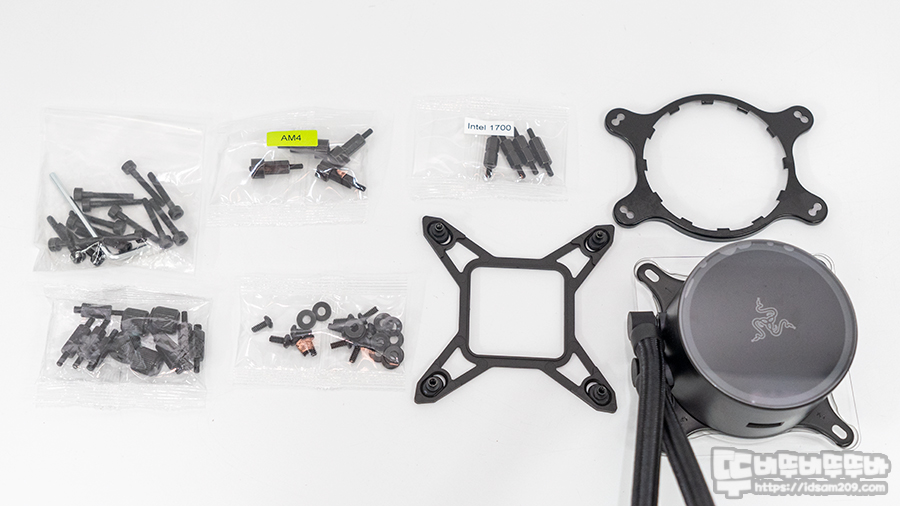 394mm 라디에이터와 유연한 400mm 길이의 워터호수로 디자인된 RAZER Hanbo Chroma RGB AIO Liquid Cooler RGB 크로마 수냉쿨러(360MM)는 Kunai 크로마 120mm 쿨링팬 3개를 기본으로 제공하며 AMD 브라켓, 인텔용 백플레이트와 브라켓 그리고 조립 관련 나사 및 스탠드오프를 제공하고 있어 AMD AM4 소켓과 인텔의 최신 LGA 1700 소켓까지 조립이 가능합니다.