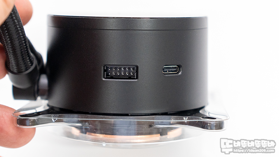 워터블록에 연결하는 케이블은 구성은 CPU 팬 커넥터는 3핀, +5V ARGB 커넥터 3핀, 라디에이터 장착 쿨링팬 4핀 소켓 브리지 방식으로 3개 연결 그리고 SATA 전원 커넥터 등이 하나로 구성된 커넥터와 USB-C to USB 2.0 9핀 커넥터로 구성되어 있습니다.