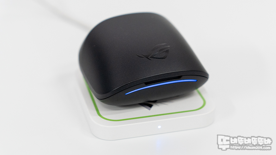 충전 케이스에 무선 이어버드 충전 시 이어버드 뒤쪽에 LED 라인을 확인으로 ROG 간지를 표현해 주고 있습니다.