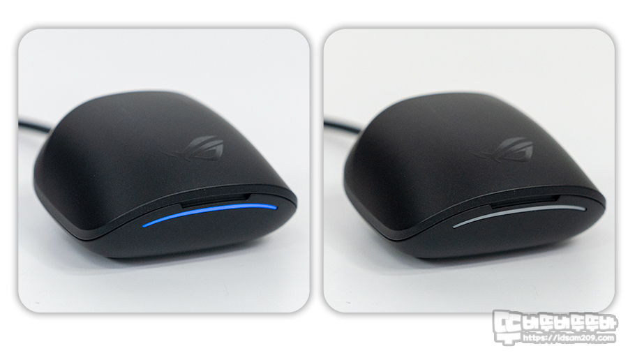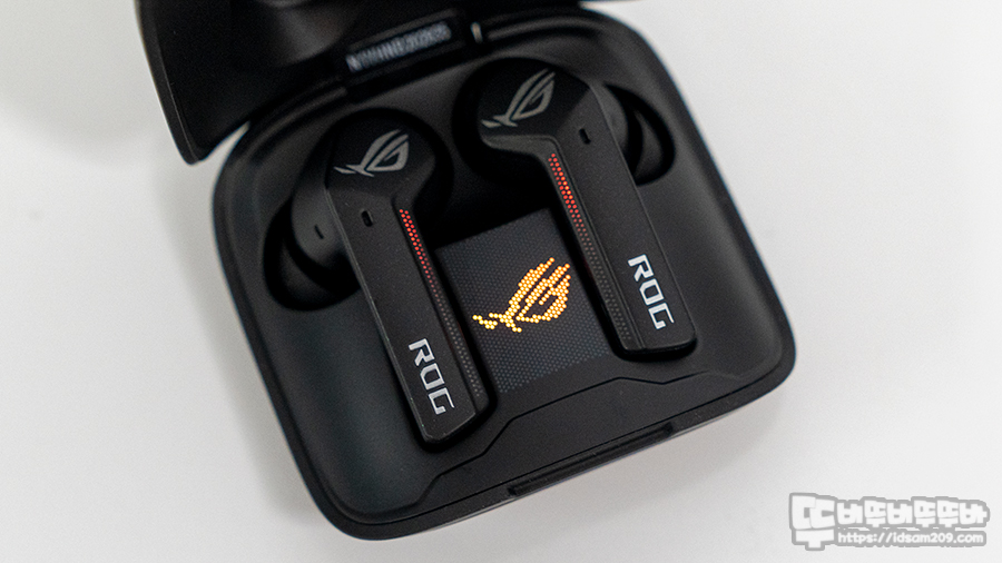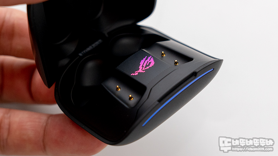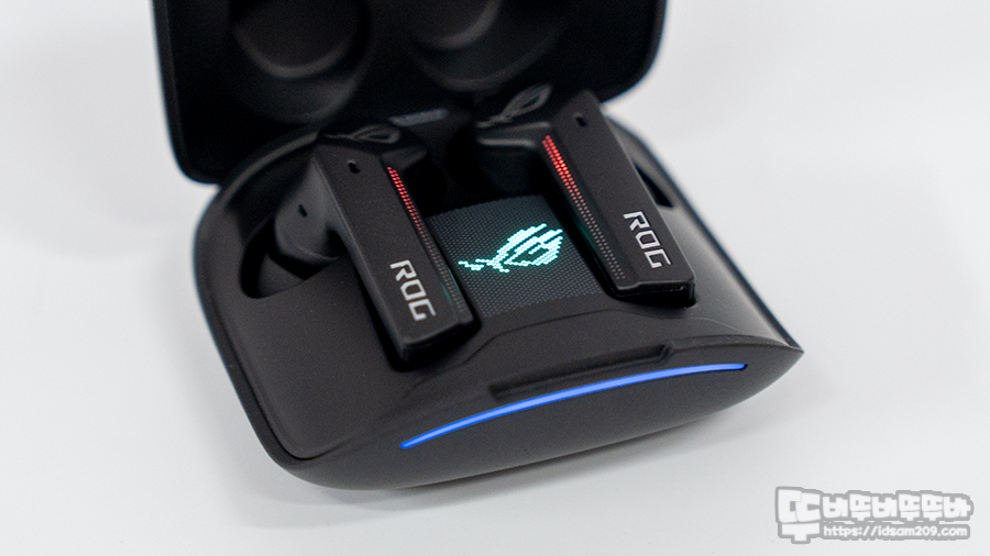 충전 케이스에 무선 이어버드 충전 시 이어버드 뒤쪽에 LED 라인을 확인으로 ROG 간지를 표현해 주고 있습니다.
