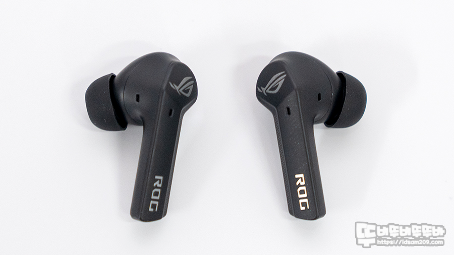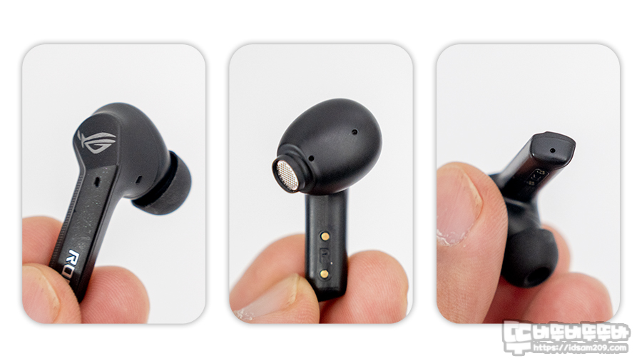이어버드 하우징 상단에는 ROG 로고가 인쇄된 터치센서, 음성 통화가 내장된 마이크 스틱 끝부분에 ROG 글자 로고가 눈에 들어오며 스틱 안쪽에는 금속 접점으로 충전되는 충전 단자를 확인할 수 있습니다.