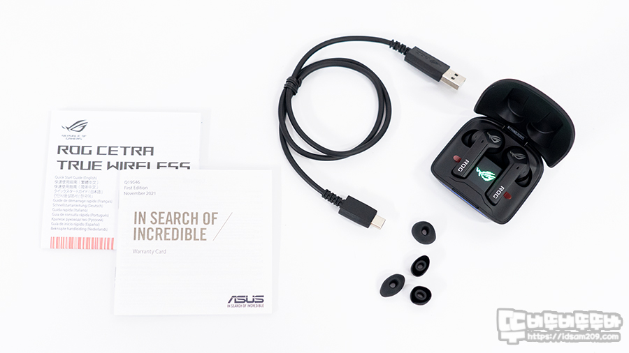 제품은 사용 설명서, 워런티 가이드, USB-C to A 충전 케이블, 여분의 실리콘 이어팁, ASUS ROG CETRA TRUE WIRELESS 블루투스 이어폰과 충전 케이스로 구성되어 있고요.