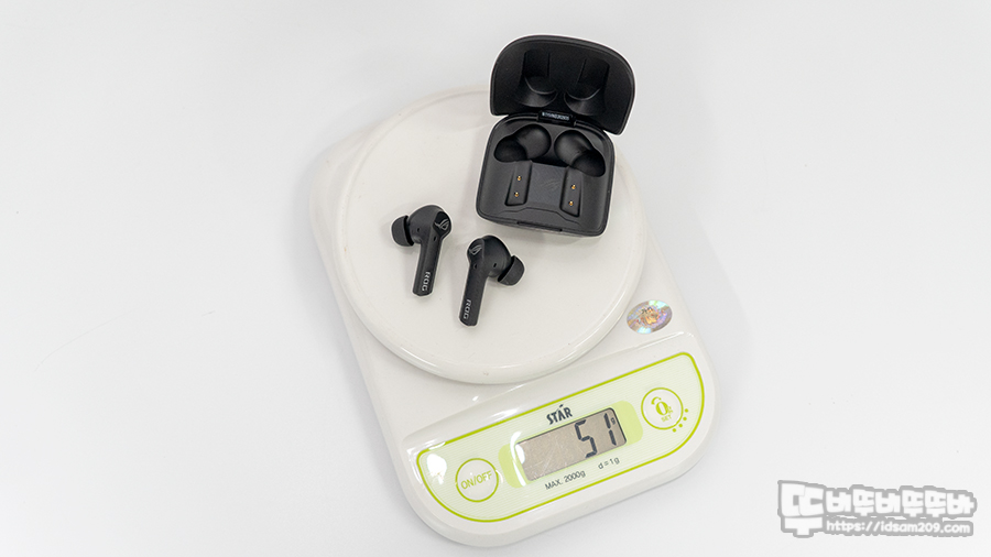 디지털 저울로 무게 측정 시 이어버드와 충전 케이스를 합친 무게가 약 51g으로 이어버드 4.5g, 충전 케이스 42g 정도의 무게를 가늠할 수 있습니다.