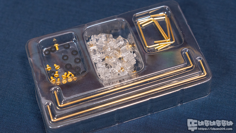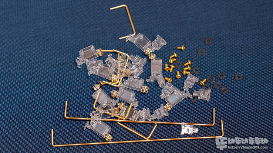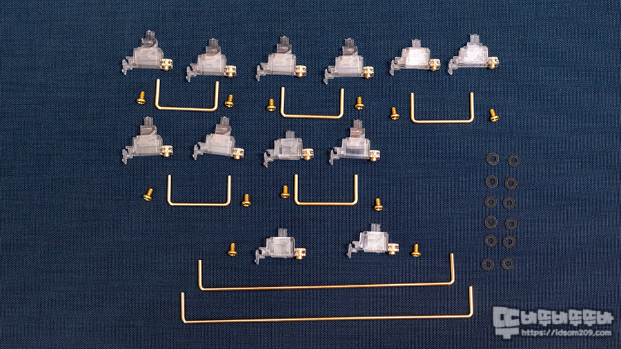 사진과 같이 마운트와 스템을 세트 12개, 짧은 와이어 5개 ( 2U ), 긴 와이어 2개 (1.65U, 1.7U) 그리고 PCB 고정용 스크류 나사와 PCB 보호용 와샤로 US 표준 104 키 키보드에 사용이 가능한 구성으로 되어있습니다.