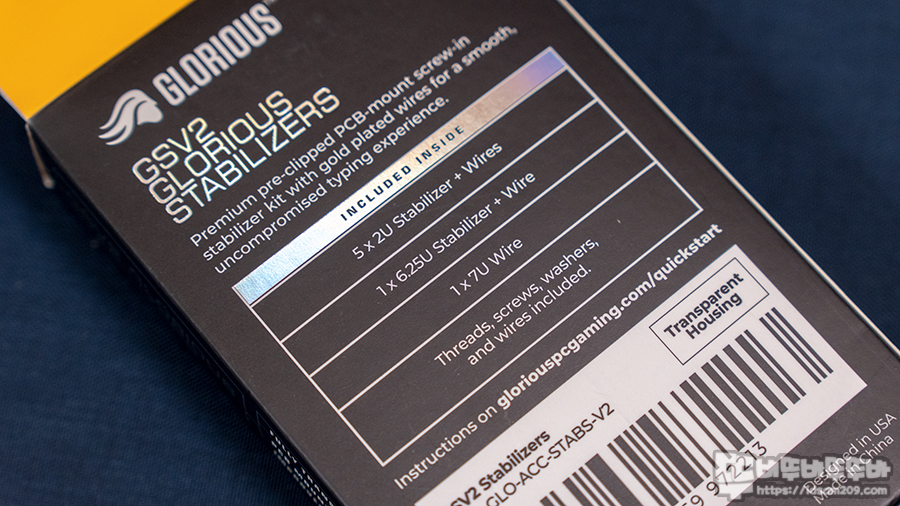 GSV2 스태빌라이저는 기존 GMMK PRO에 적용되었던 GOAT 스태빌라이저 개선하여 철심 부착 지점 재설계, 하우징 내부의 윤활을 더 잘 수용할 수 확장, 대부분 키보드에서 호환될 수 있는 규격 수정한 게 특징으로 패키지에는 GMMK PRO와 GMMK2 호환이 가능하다는 내용과 투명 하우징임을 표현되고 있네요.