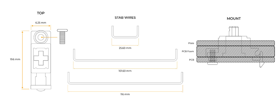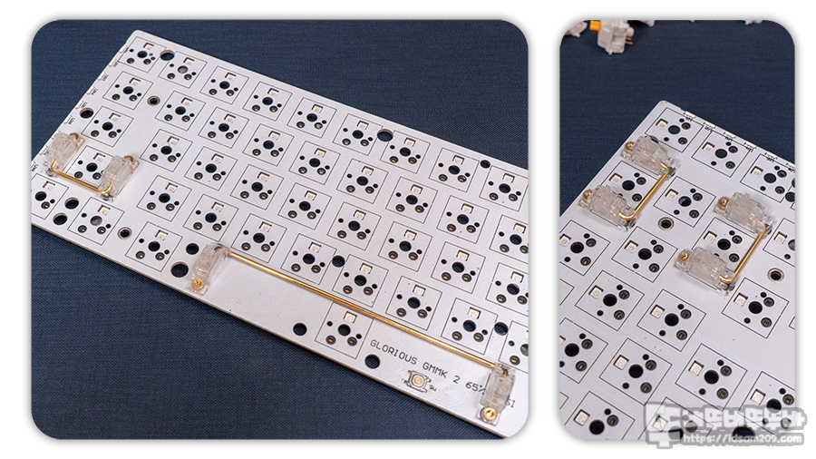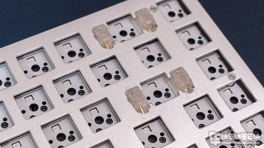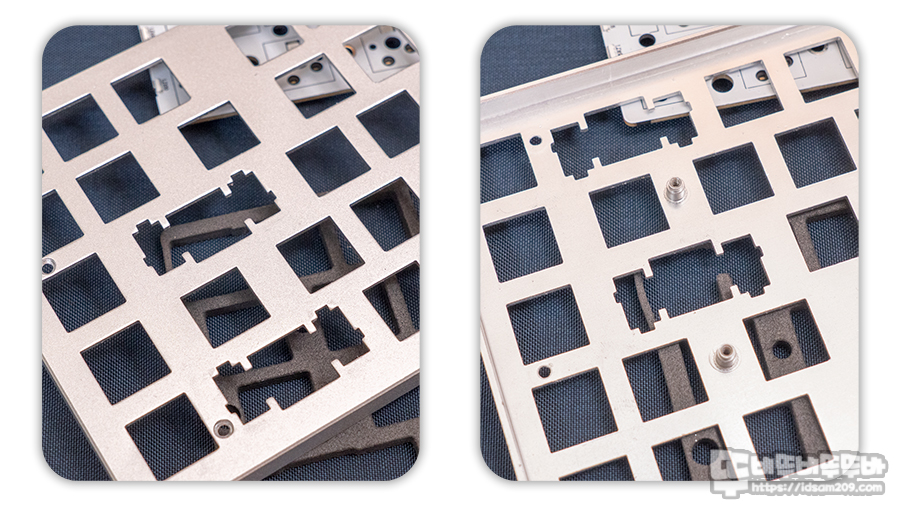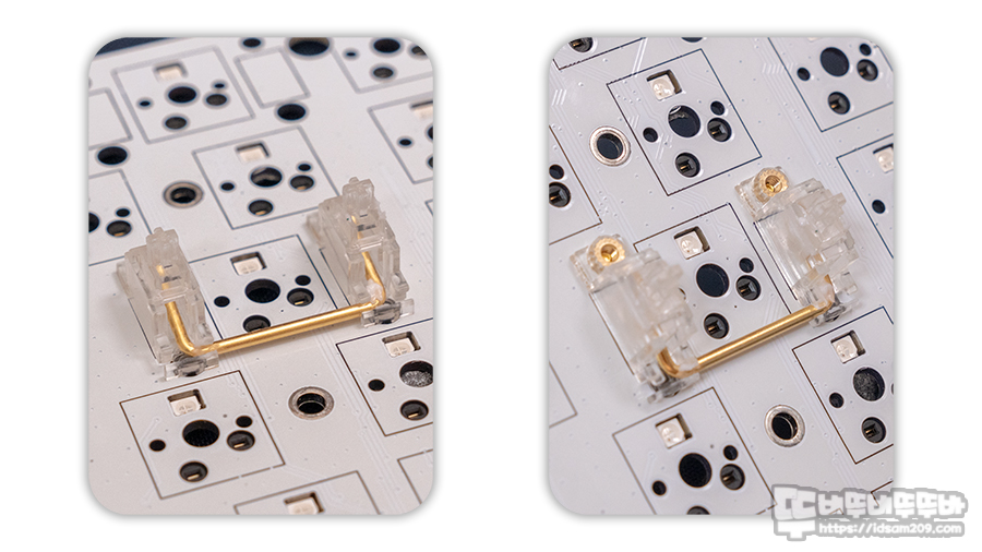 대부분의 보강판 고정용 스태빌라이저의 경우 마운트가 보강판에 고정되지 않는 유격 문제, 스태빌라이저 움직임으로 발생하는 소음을 유발하는 반면에 PCB 마운트 방식은 스태빌라이저 움직임으로 발생하는 소음만 발생하는 편이라 소음을 컨트롤하는 부분에선 많은 키보드 매니아분들이 PCB 고정 방식을 사용하기에 추천드릴 수 있는 제품입니다.