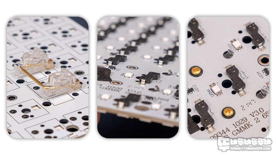 대부분의 보강판 고정용 스태빌라이저의 경우 마운트가 보강판에 고정되지 않는 유격 문제, 스태빌라이저 움직임으로 발생하는 소음을 유발하는 반면에 PCB 마운트 방식은 스태빌라이저 움직임으로 발생하는 소음만 발생하는 편이라 소음을 컨트롤하는 부분에선 많은 키보드 매니아분들이 PCB 고정 방식을 사용하기에 추천드릴 수 있는 제품입니다.