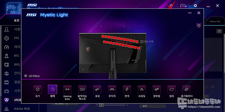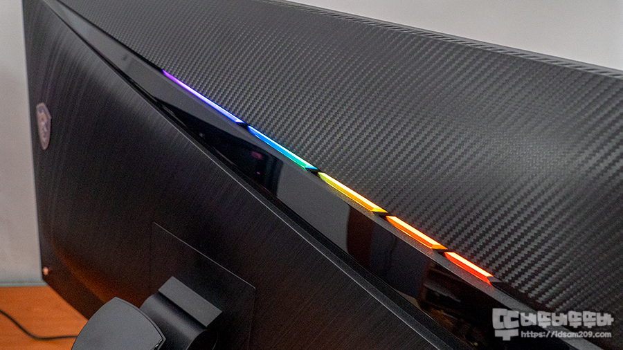 상단에 LED 라이팅에 관련된 메뉴를 선택 시 사용 가능한 LED 라이팅 기능은 단순한 효과에서 MSI 미스틱 라이트를 지원하는 기기와의 연동도 가능하지만 모니터 뒷면의 일부 영역에서만 표현되는 제한적인 부분이기에 그럴싸한 분위기 있는 연출을 생각하지 않으시는 게 좋습니다.