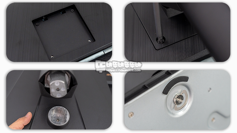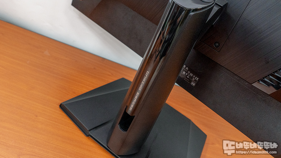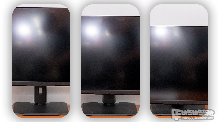 조립 후에는 받침대를 이용한 좌우 스위블, 스탠드를 이용한 높이 조절이 되니 모니터를 세울 때 주의가 필요합니다.