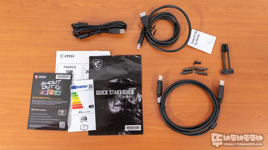 제품은 퀵 스타트 가이드와 USB A to B 케이블, HDMI 2.1 케이블, DP 케이블, 베사 홀 스탠드오프, 스탠드 고정 나사, 그리고 모니터 아래에 부착하는 마우스 번지 그리고 AC 전원 케이블로 구성되어 있습니다.