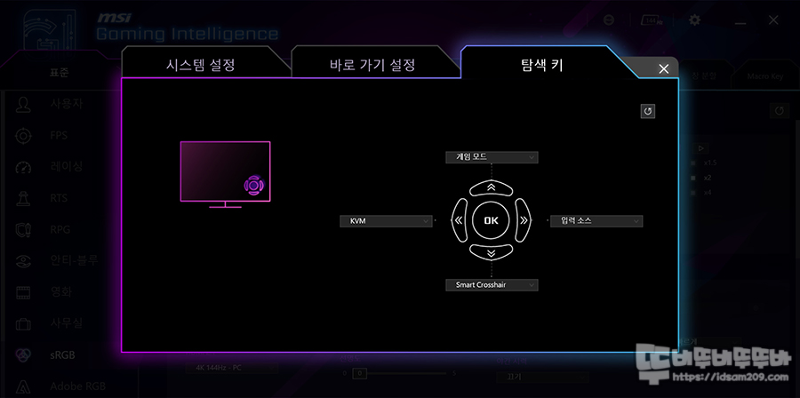 탐색 키는 모니터 뒷면에 OSD 조이스틱 버튼을 누르지 않고 십자 방향 선택으로 사용하는 메뉴를 선택하는 기능으로 자주 선택하는 기능을 선택하시는 게 좋습니다.