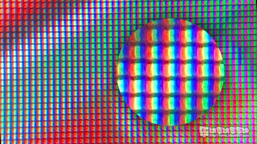 혹시나 확대경으로 살펴보면 뭔가 다를까? 해서 보니 수많은 RGB 도트를 확인할 수 있었는데 4K 영상이나 사진을 감상할 때 상당히 선명함을 느낄 수 있었습니다.