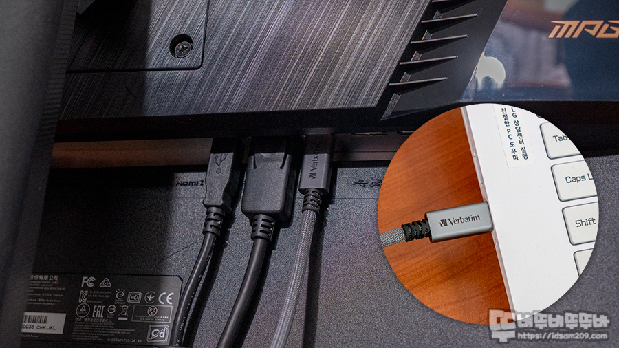 KVM 기능을 지원하는 제품이라 그런지 HDMI1 / HDMI 2 / DP 포트 옆에 한 쌍으로 USB-B 포트가 부착된 걸 확인할 수 있는데 편하게 사용하시려면 컬러 점선의 구성된 세트로 연결하시면 좋습니다.