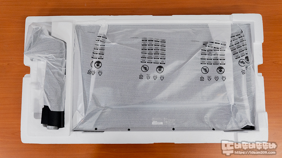 패키지에서 모니터가 포장된 스티로폼을 꺼내면 겉 부분에 케이블류와 받침대, 스티로폼을 오픈하면 측면에 스탠드와 모니터가 포장된 것을 확인할 수 있는데요.