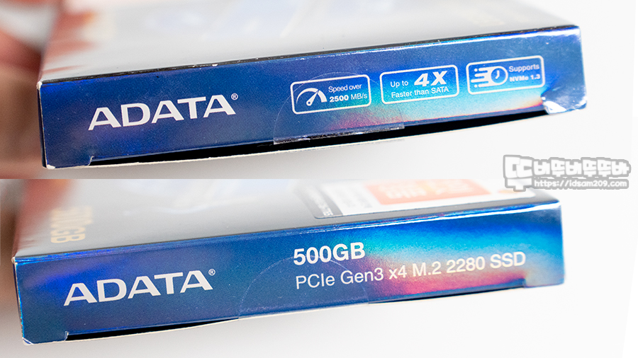 패키지 측면에 인쇄 내용에서는 최대 읽기 속도 2,500MB/s, SATA보다 4배 빠른 속도, NVMe 1.3 지원 그리고 Gen3 x4 500GB M.2 2280 규격의 SSD 정보를 확인할 수 있고요.