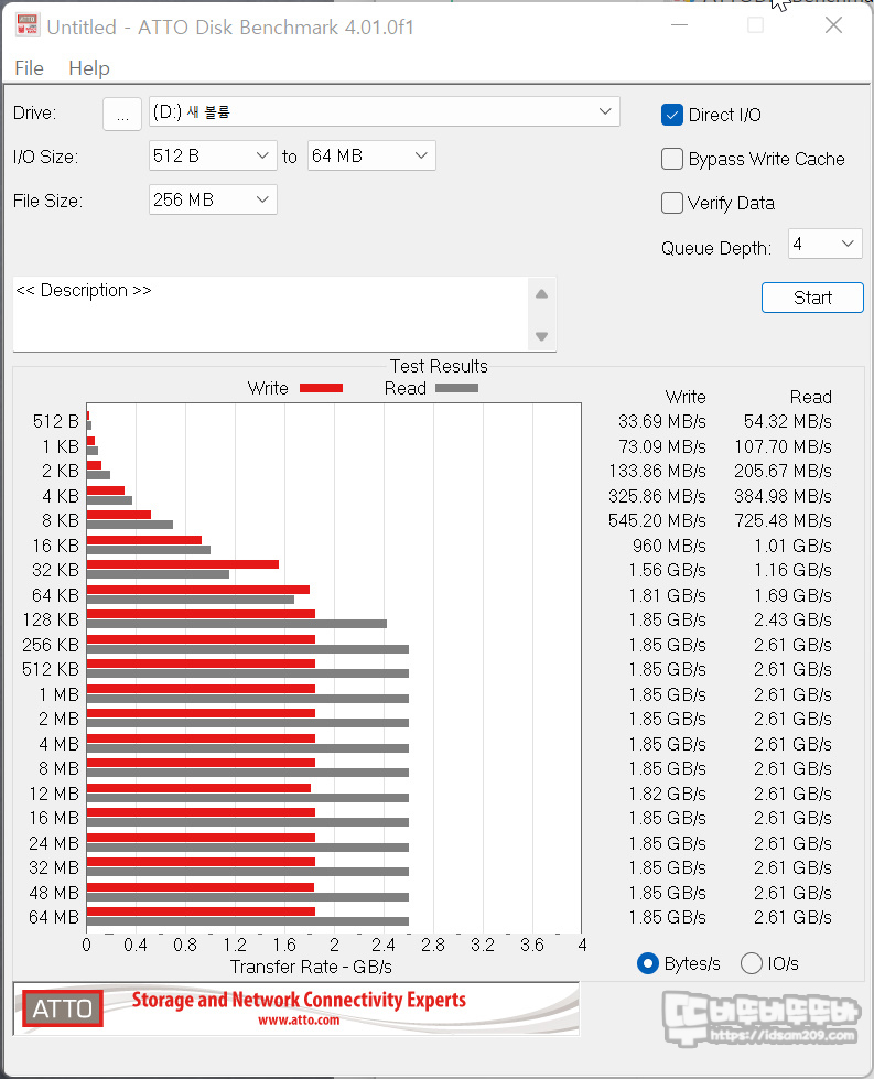 ATTO 디스크 벤치에서는 256KB부터 읽기 속도는 2.61 GB/s, 쓰기 속도는 1.85 GB/s의 결과를 보여주고 있습니다.