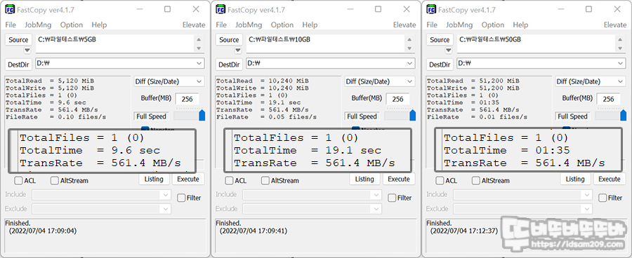 FastCopy를 파일 복사 테스트는 C 드라이브에서 ADATA LEGEND 740 500GB가 설치된 D 드라이브로 5GB / 10GB / 15GB 더미 파일 복사하는 쓰기 테스트 시 약 560MB/s 대 속도를 보여주며 반대의 읽기 테스트의 경우 약 520MB/s 대 속도를 확인할 수 있습니다.