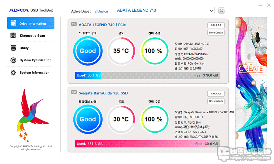사용 중인 ADATA 디스크의 상태, 온도, 잔여 수명 등 디스크의 전체적인 컨디션을 확인 및 진단과 최적화를 지원하고 있으니 SSD 관리 차원에서 사용하시면 좋습니다.